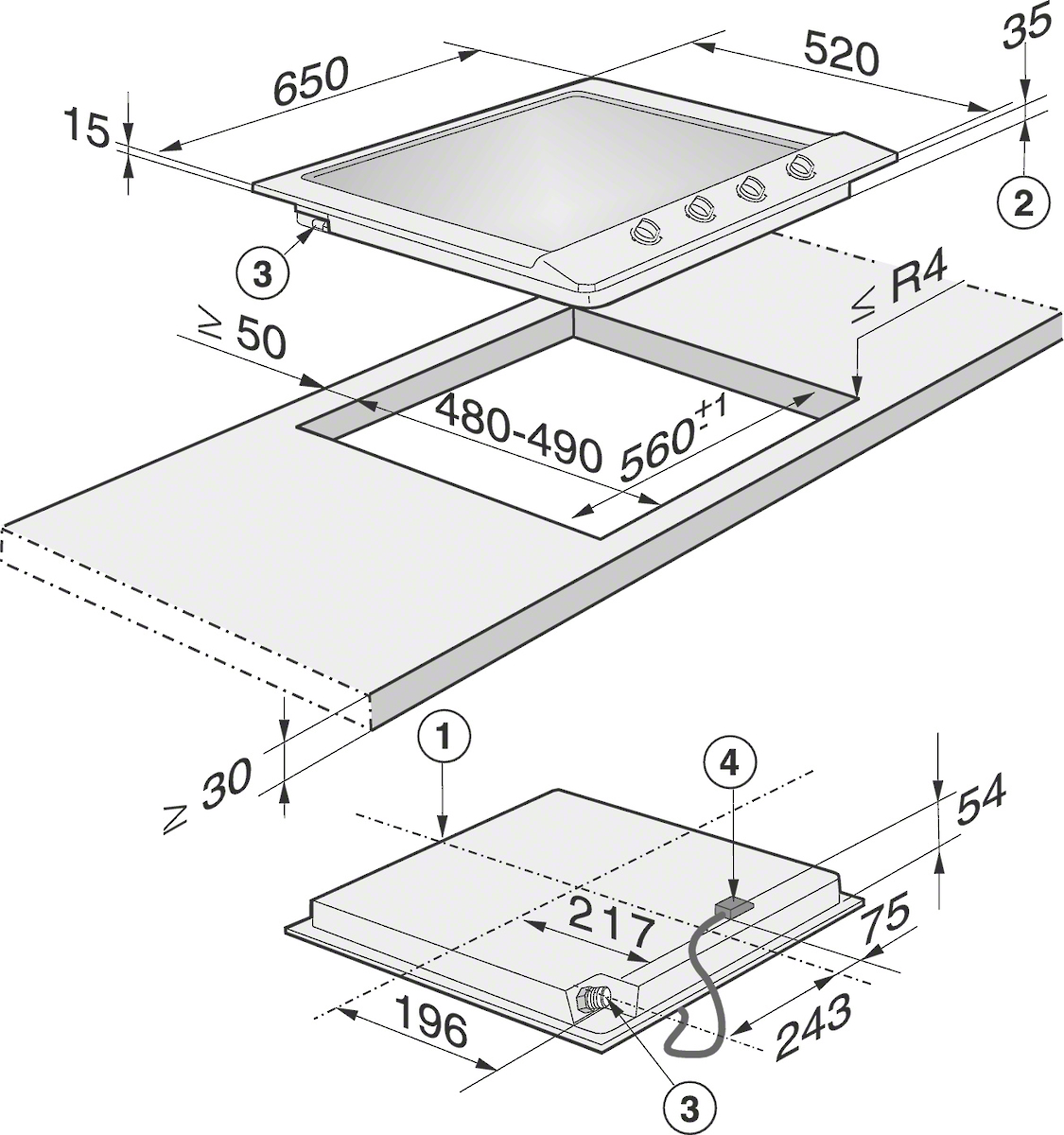Afmetingen uitsparing in mm (diepte) bij aansluitende inbouw 480