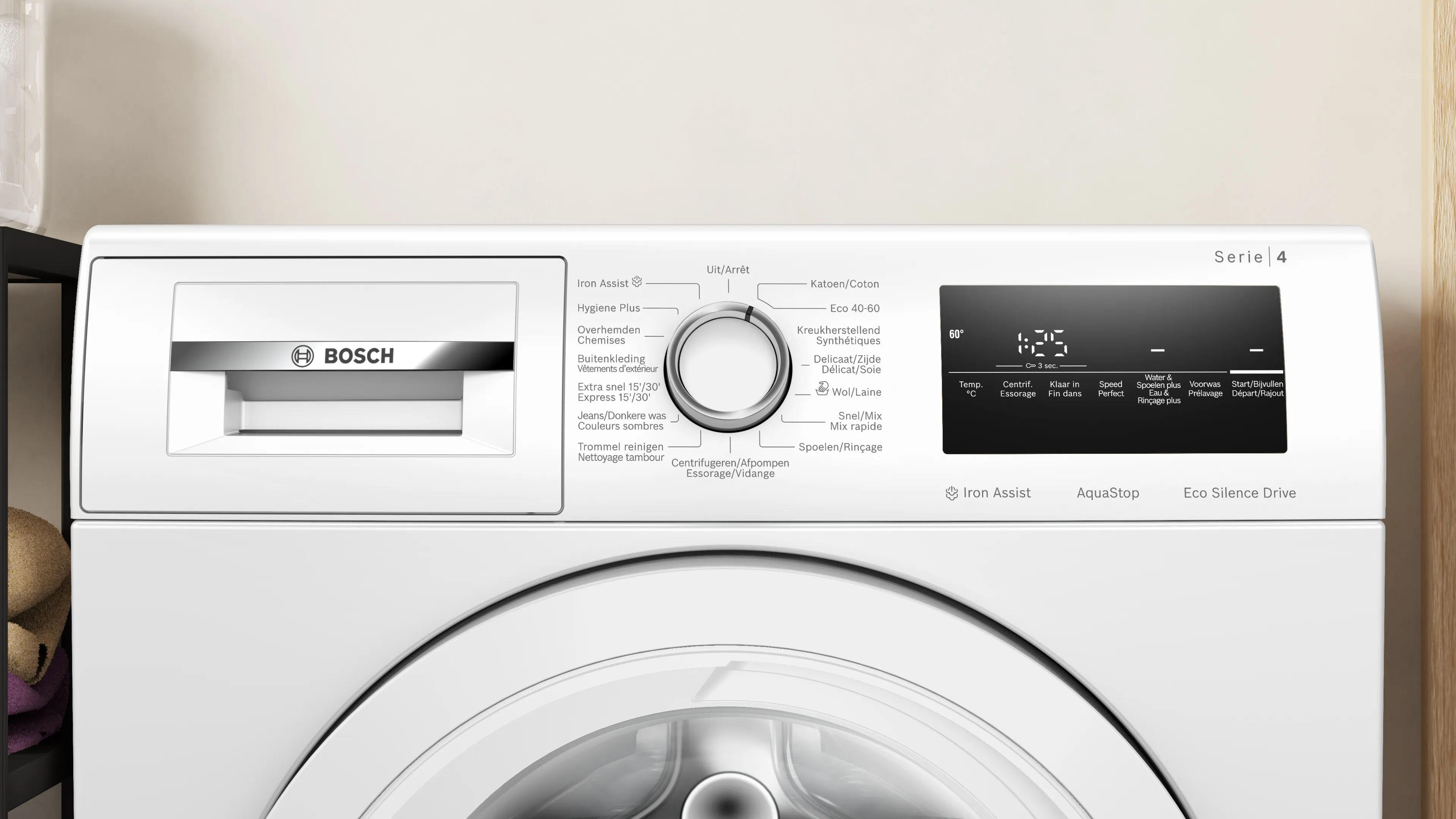 Aanvullend wasprogramma Afpompen/Centrifugeren, Eindtijduitstel, Extra snel 15'/30', gemakkelijk strijken met stoomondersteuning, Keuze voor centrifugeersnelheid, Mix/Snel, Outdoor, Overhemden, SpeedPerfect, Spoelen, Start/Pauze met bijvulfunctie, Temperatuur, Voorwas