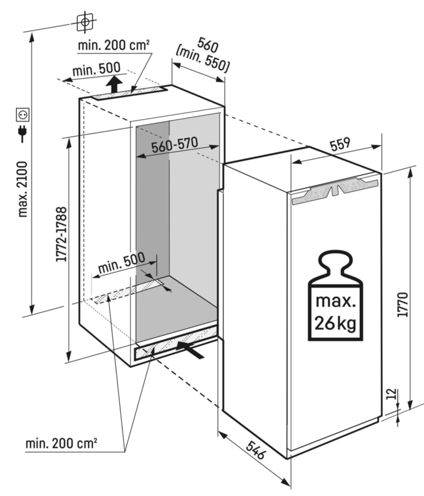 Inbouwdiepte minimaal 55,0 cm Max. Meubelgewicht koeldeel 26 kg