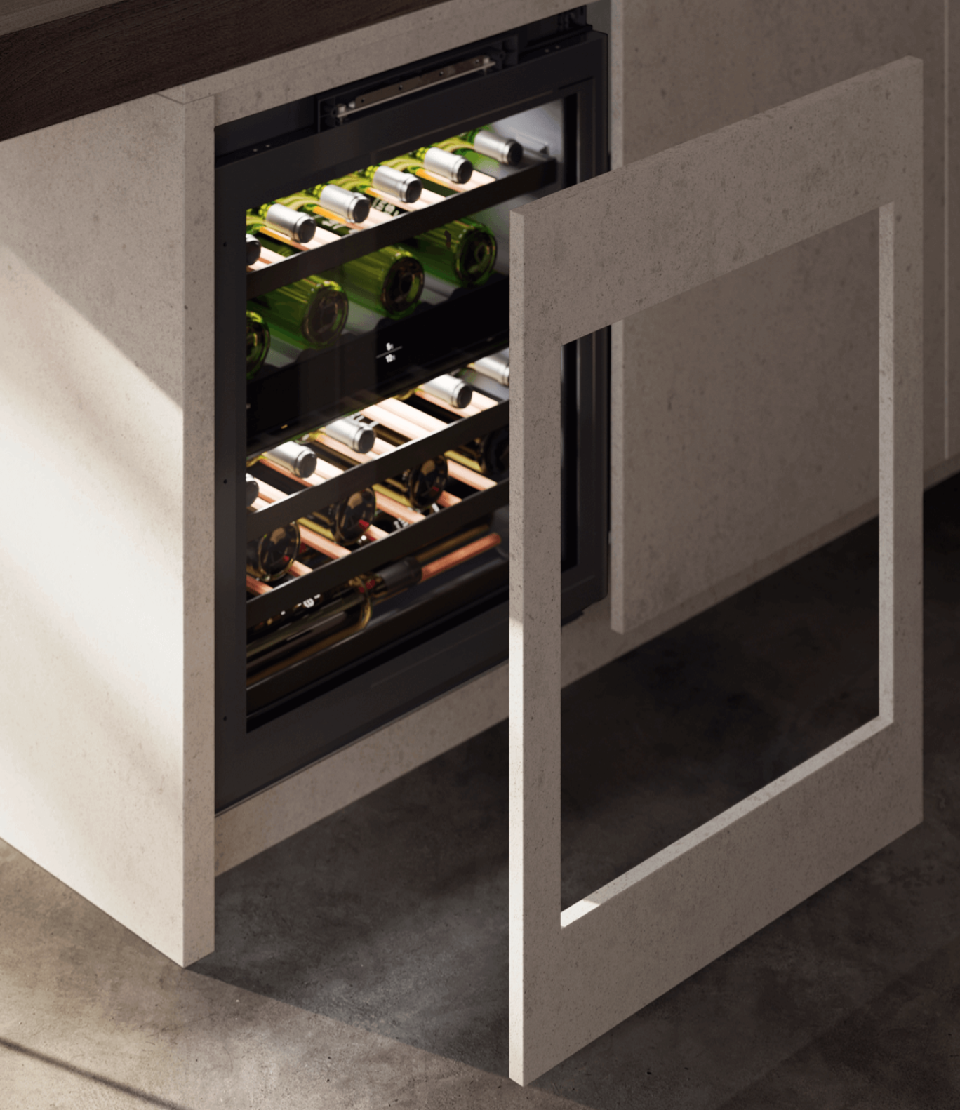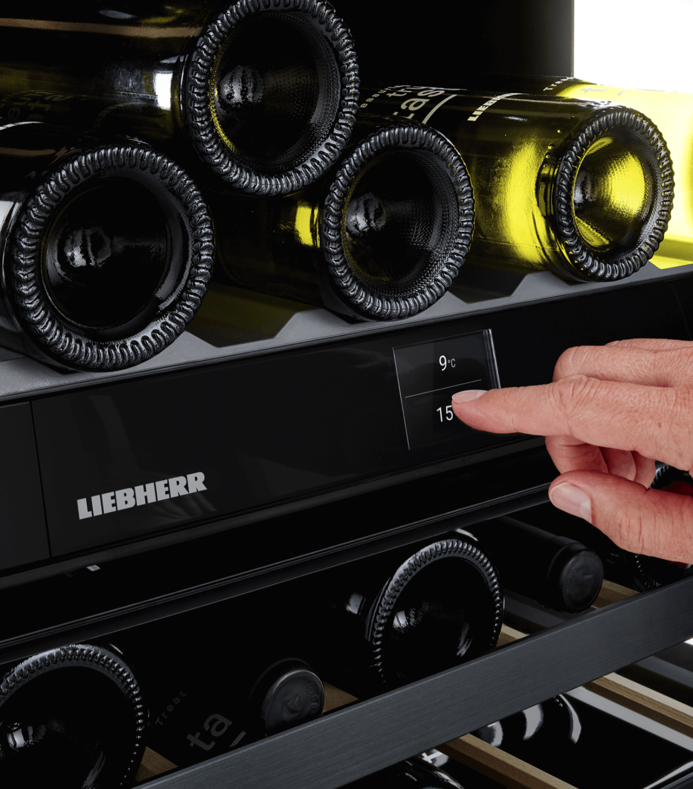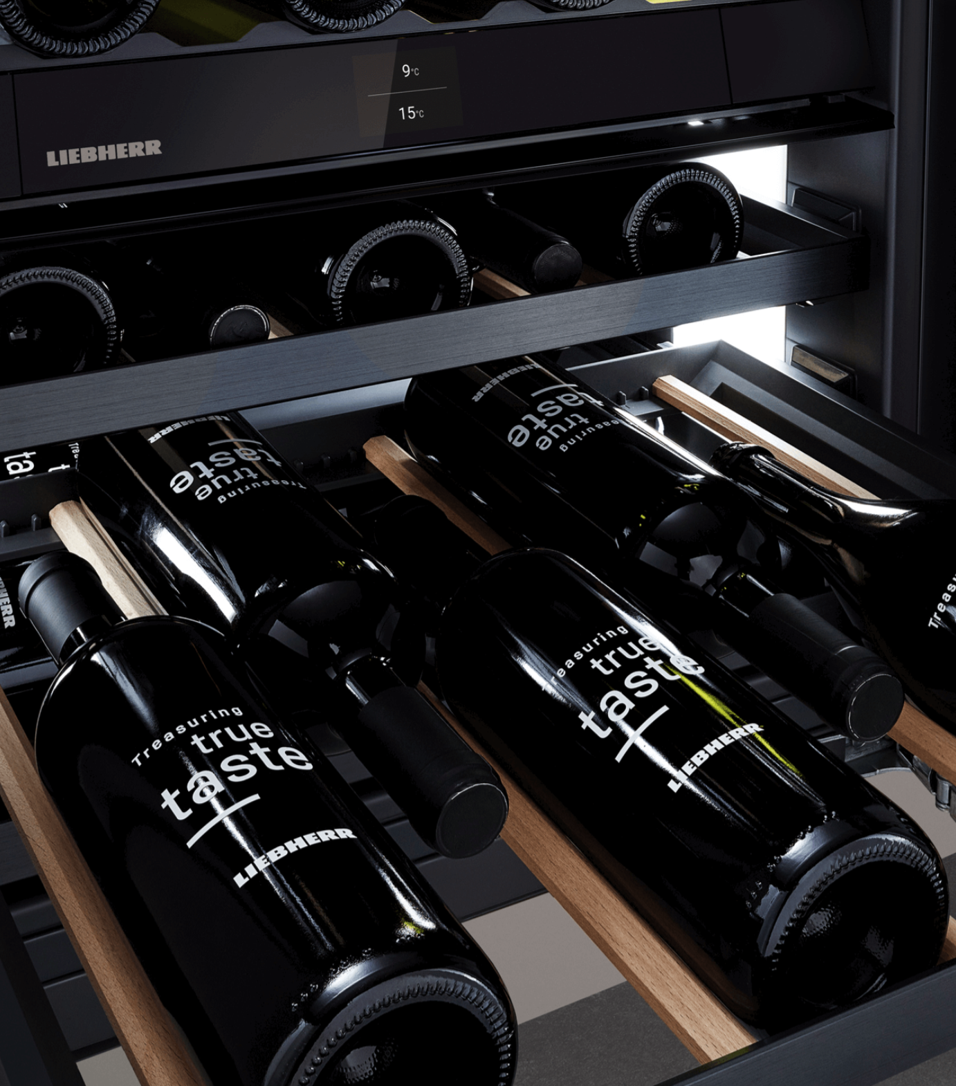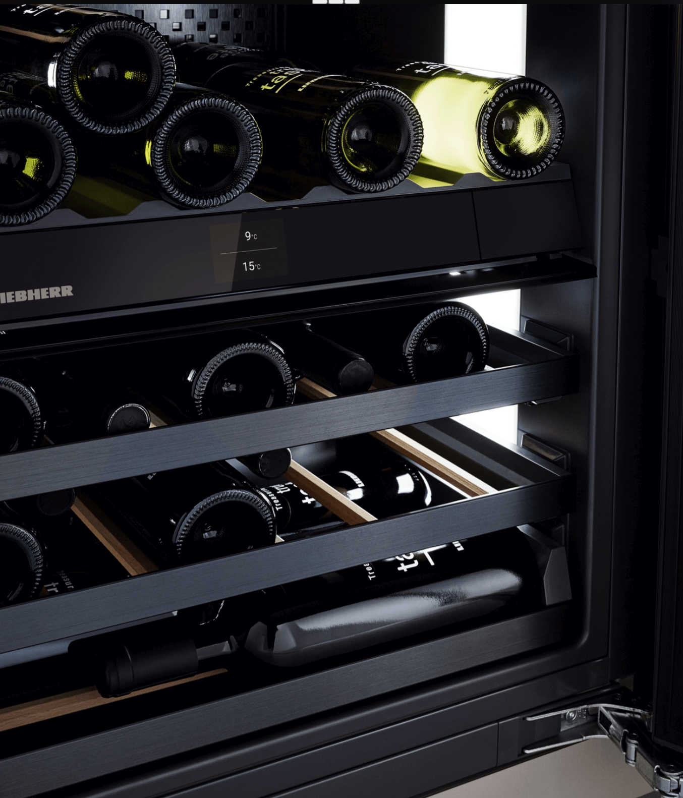 Klimaatzone koeldeel 2 wijntemperatuurzones Flesopslag Houten draagplateaus met aluminium front, flexibel