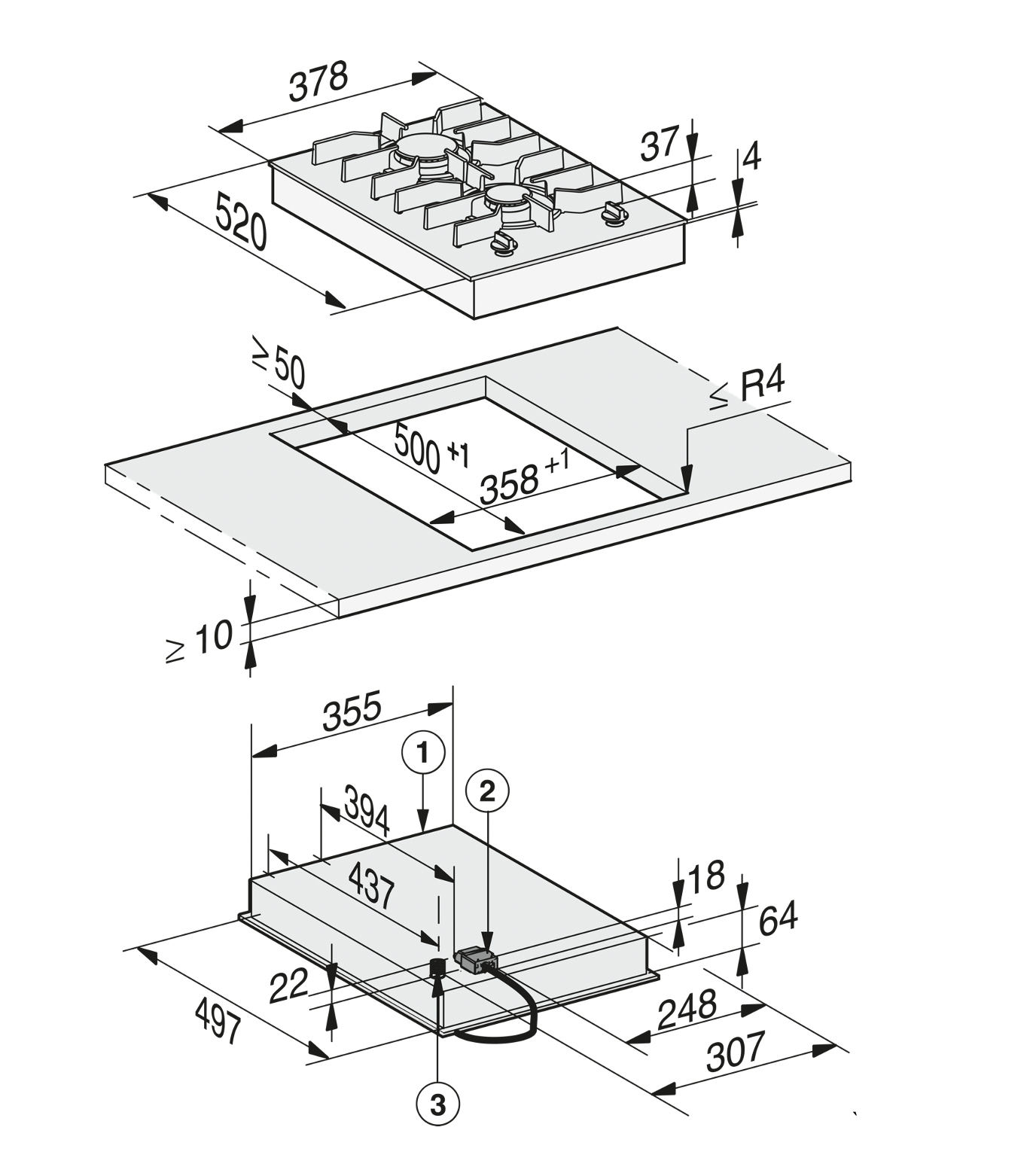 Afmetingen uitsparing in mm (diepte) bij aansluitende inbouw: 500