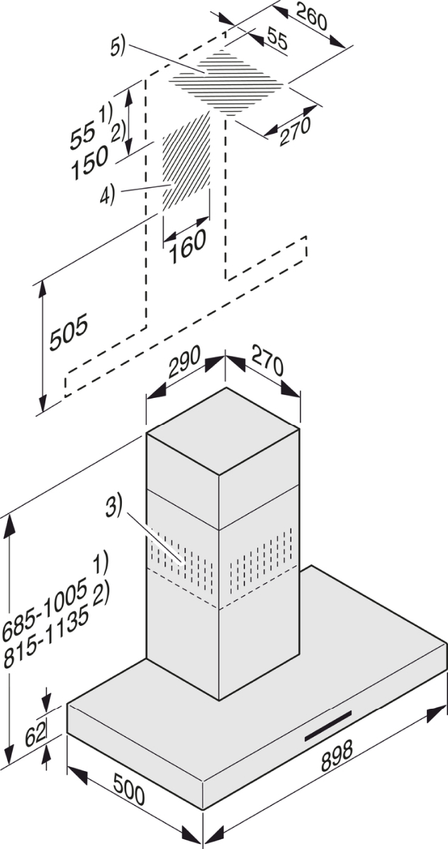 Totale hoogte afzuigkap luchtafvoer en extern in mm 685–1005
